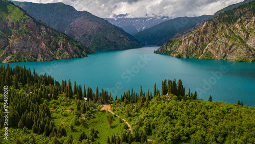 Aerial view of Sary-Chelek Lake in Kyrgyzstan. Deep blue alpine water surrounded by forested mountains and golden valleys within a pristine biosphere reserve