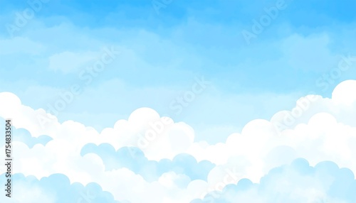 A tranquil, serene depiction of a daytime sky filled with fluffy, white clouds against a gradient of vibrant, azure blue. The clouds vary in density