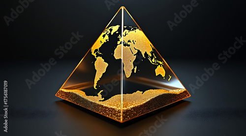 Glass pyramid filled with golden particles forming world map, glowing with bright yellow light on dark background, symbolizing global connection