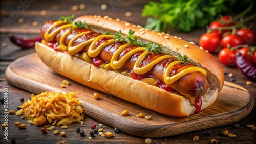 A succulent grilled sausage nestled in a toasted bun, adorned with tangy mustard, ketchup, and a sprinkle of fresh herbs, rests on a rustic wooden board alongside assorted condiments