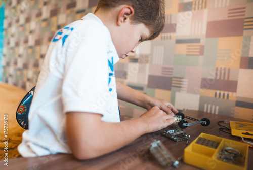 Little cute boy plays with mechanical constructor at the table
