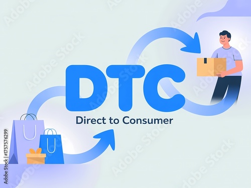 Dtc direct to consumer business model with arrows showing product flow from warehouse to customer delivery