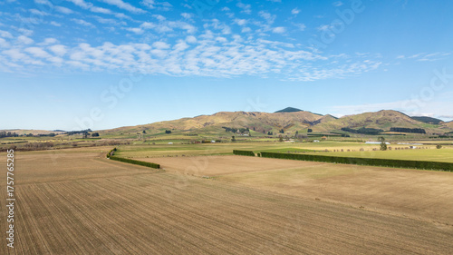 Drone perspective of vast area agriculture and farm land in the heartland of the South Island NZ