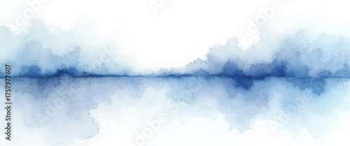 Abstract blue watercolor horizon reflection on transparent background, misty gradient ink design for modern art and graphic overlays