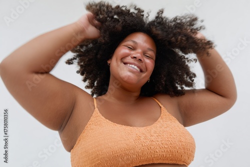 Authentic plus size woman confidently embracing natural beauty with joyful expression Premium lifestyle content for modern self-love and body positivity campaigns