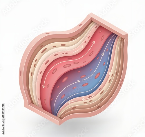 Isometric cutaway illustration of capillaries or vessels within muscle/tissue layers, showing blood flow (red/blue) and oxygen exchange. A concept for circulatory health.