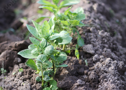 Potatoes growing in a ploughed field. Ecological farm vegetables.