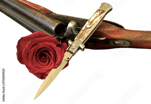 sawn off shotgun automatic knife and red rose isoalted on transparent background