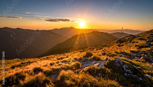 A breathtaking landscape photo captures a vibrant sun setting over layered mountain peaks casting long shadows. Golden light bathes the grassy foreground