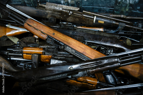 A display of surrendered weapons, including rifles and pistols, laid out on a table