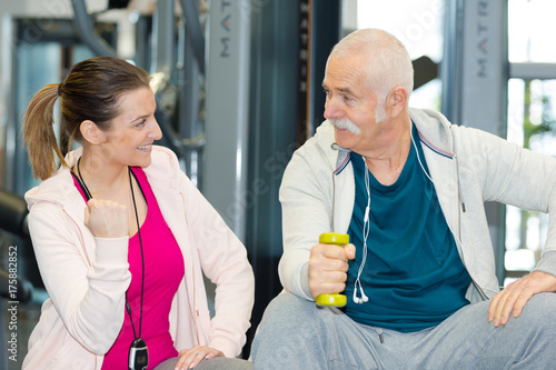 happy physiotherapist assisting senior man in lifting dumbbells