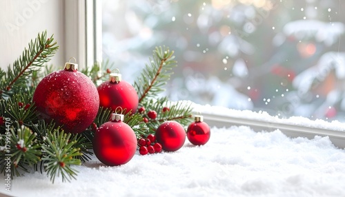 Festive red ornaments and greenery arranged on a snowy windowsill with a blurred winter landscape outside