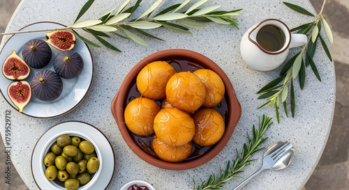 Mediterranean food arrangement with figs, olives, honey balls, and olive oil on table