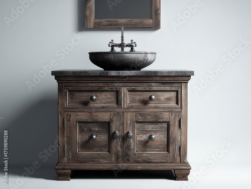 Rustykalna, drewniana szafka łazienkowa z umywalką nablatową z ciemnego kamienia i kranem w stylu vintage, lustro wiszące nad.