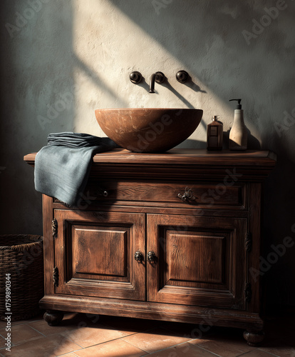 Rustykalna szafka łazienkowa z ciemnego drewna z kamienną umywalką nablatową, bateria ścienna. Oświetlona promieniami słońca.