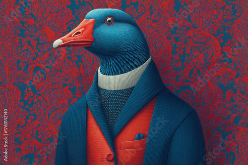 Anthropomorphic duck dressed in a sharp red suit and blue blazer stands before a vivid textured backdrop, creating a surreal, stylish composition with bold color contrast.