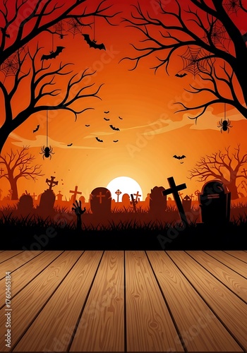 Halloween graveyard scene with tombstones, bats, and a wooden floor.