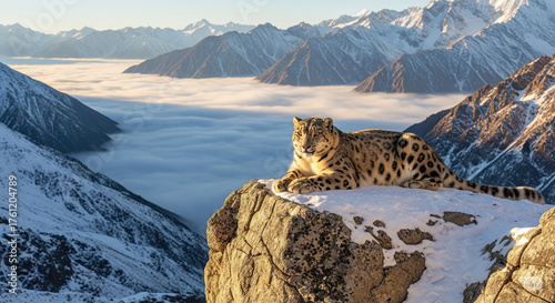 Majestic snow leopard on a rock overlooking a snowy mountain range above the clouds at sunrise.