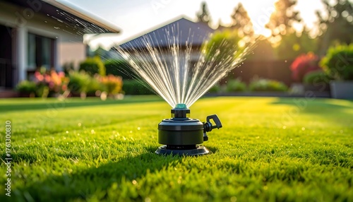 Sprinkler irrigates a lush lawn, sunlight streams through, blurring the background