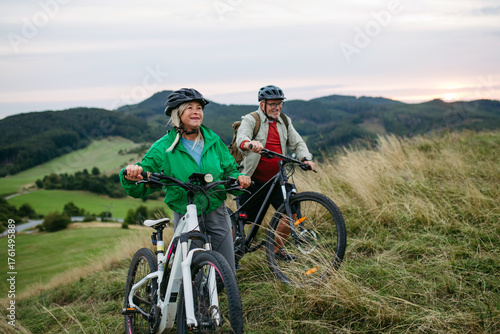 Older couple cycling together in nature, smiling and enjoying outdoor adventure.