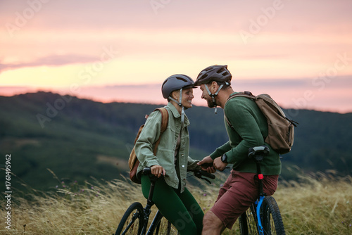 Couple cycling together in nature, smiling and enjoying outdoor adventure.