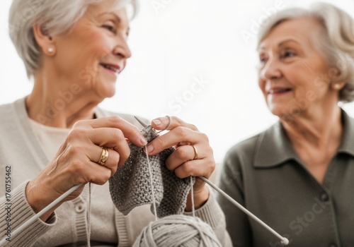 Two elderly women enjoying their knitting session together. They exude warmth and tranquility, creating a comforting atmosphere.