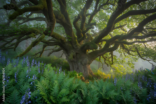 Ancient, moss-covered tree stands majestic amidst lush greenery and vibrant blue flowers.