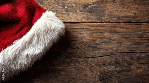 Close up of a fluffy red santa hat with white trim resting on a rustic wooden surface