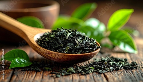 Wooden spoon with dried tea leaves on rustic surface — earthy contrast of fresh and aged botanicals.