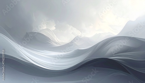 An ethereal digital painting featuring abstract, flowing forms resembling rolling hills or waves under a cloudy, diffused light. The palette is mostly grayscale