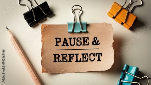 Inspiring 'Pause & Reflect' message on a note, surrounded by office supplies, perfect for motivation and mindfulness