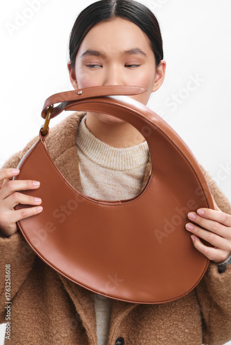 Asian woman holds a stylish bag close to her face, showcasing a soft sweater and coat. The pose conveys elegance and calm, highlighting fashion, texture, and contemporary lifestyle in a bright studio