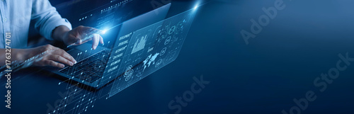 DevOps network connection concept. Software engineer hand working on a laptop computer with graphical CI/CD pipeline automation deployment container integration efficiency.