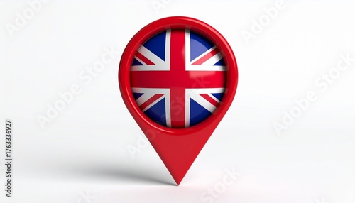 "Red map location pin featuring Union Jack flag inside circular top, set against plain white background."