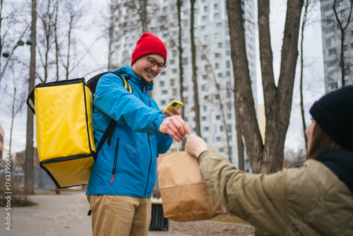 Smiling delivery man holding a smartphone while handing a paper bag of takeaway food to a customer in an urban park, surrounded by trees and buildings on a chilly winter day