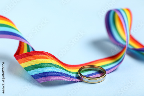 Rainbow ribbon with wedding ring on blue background, closeup. LGBT concept