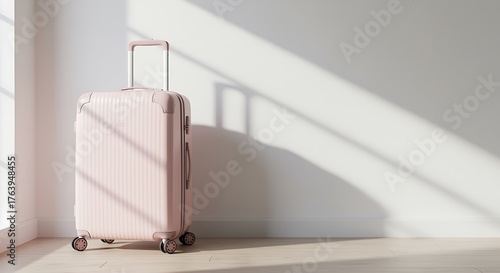 A stylish pink suitcase stands ready for travel, bathed in soft sunlight near a window, evoking wanderlust and adventure