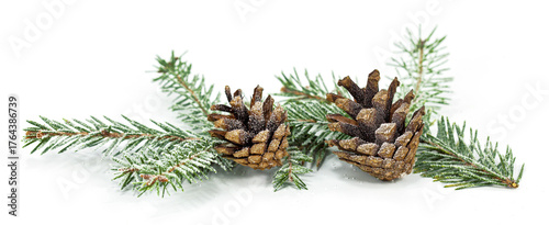 Dwie szyszki i świeże gałązki świerkowe oprószone śniegiem na białym tle