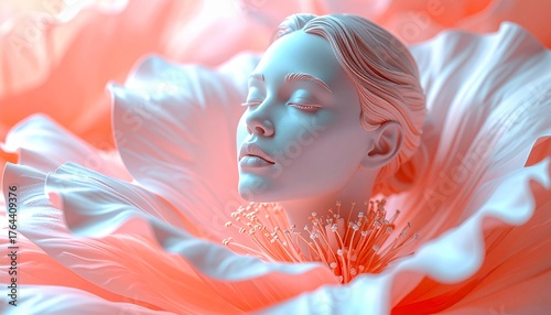 Wyrzeźbiona głowa kobiety umieszczona wewnątrz pięknego dużego kwiatu w odcieniach różu.