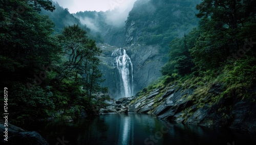Lush waterfall cascading into a tranquil pool, surrounded by misty mountain