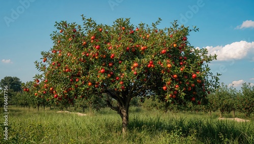 Vibrant pomegranate tree laden with ripe fruits in an orchard.