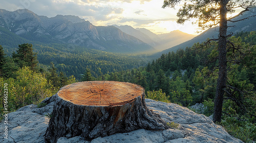 Tree stump on rocky ledge with mountains in the background Generative AI