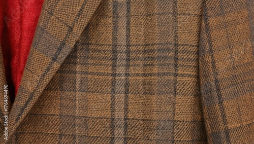 Classic wool blazer with checkered design and red linen lining, featuring a close-up of a welt pocket in traditional men's style.