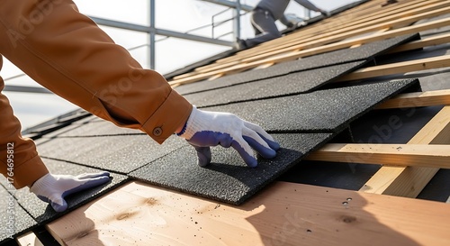 Construction worker installing asphalt shingles on a residential roof during daytime.