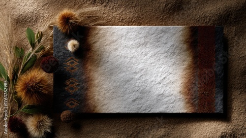 A large blank rectangular canvas of an empty dark brown background, with some dried flowers on it, decorated in an ethnic, boho, earth-toned style.