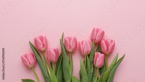 Floral Arrangement with Pastel Hues. Pink Tulips on a Pale Pink Surface, Spring Design.