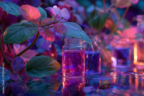 Bliski plan na małą butelkę z fioletowym płynem, otoczoną innymi naczyniami i roślinami, w intensywnym, magicznym, purpurowo-niebieskim świetle.