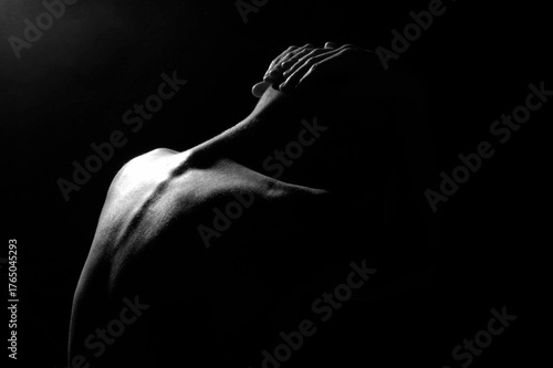 Black and white artistic portrait of a woman’s body with hands and shadows