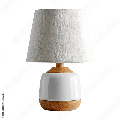 Modern Scandinavian table lamp with white fabric shade. glossy white ceramic base. and natural woo