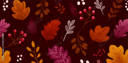 Dieses nahtlose Vektormuster zeigt eine reiche Herbstkomposition aus bunten Blättern und leuchtenden Beeren auf einem warmen, dunklen Hintergrund.